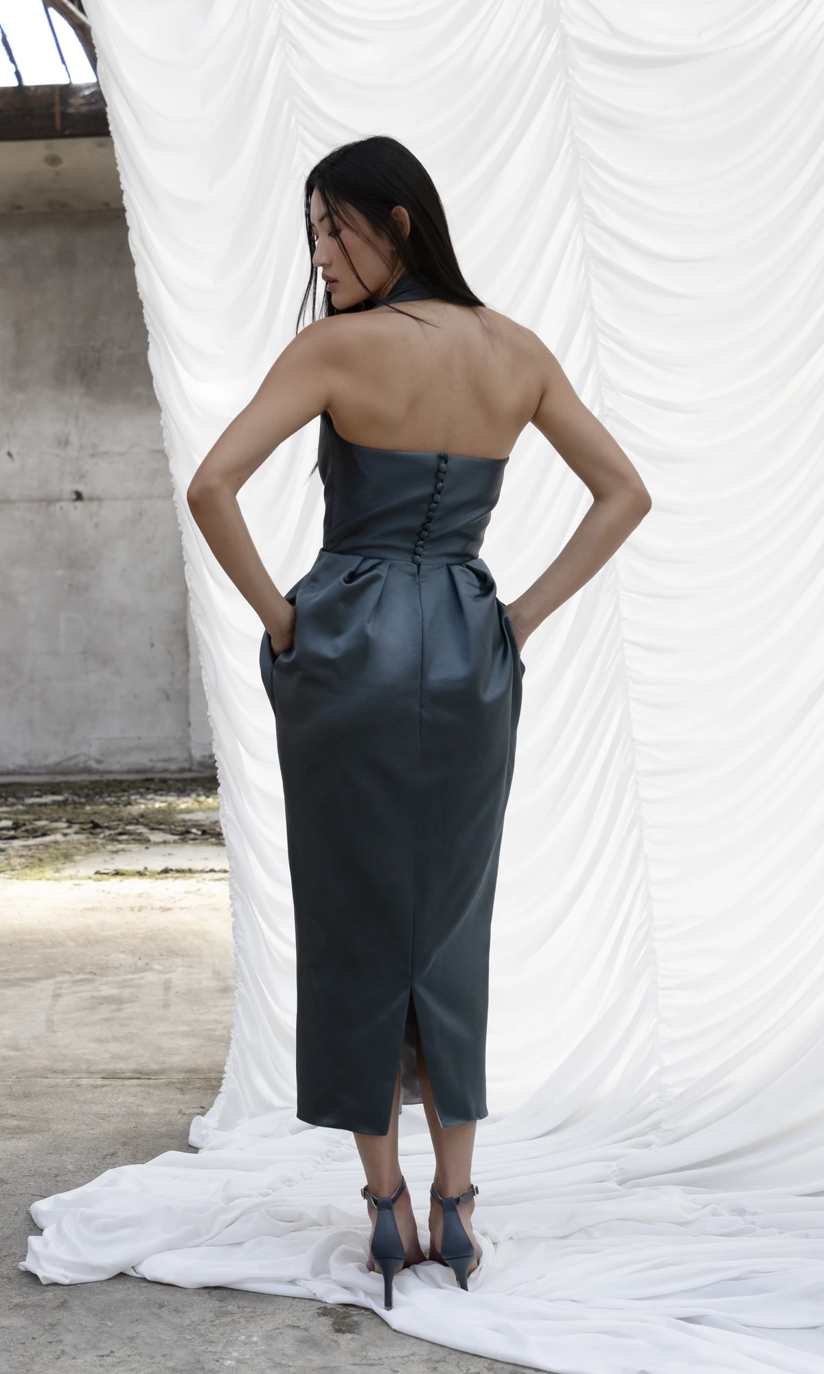 This evening or cocktail dress reflects my obsession with vases. Made from midnight blue silk duchess satin, you can of course choose it in another color.
