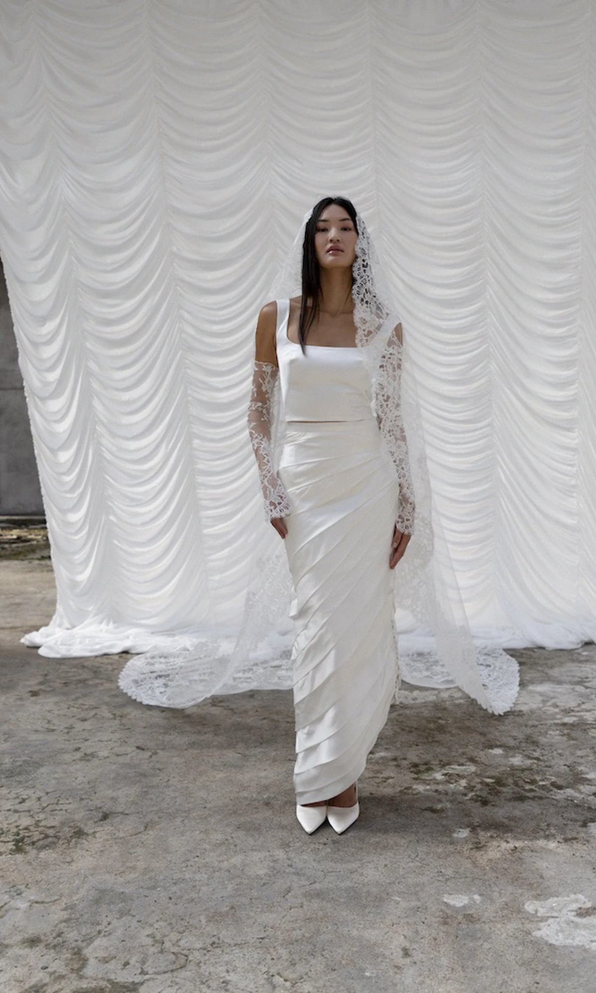 This separable silk satin wedding dress has something unique, a certain je ne sais quoi. You will love its abundance of silk bands and the asymmetry of the skirt’s hemline. Worn with an XXL Calais lace veil, you will look like a goddess with an undeniably modern allure. For brides seeking freedom of movement and uniqueness.