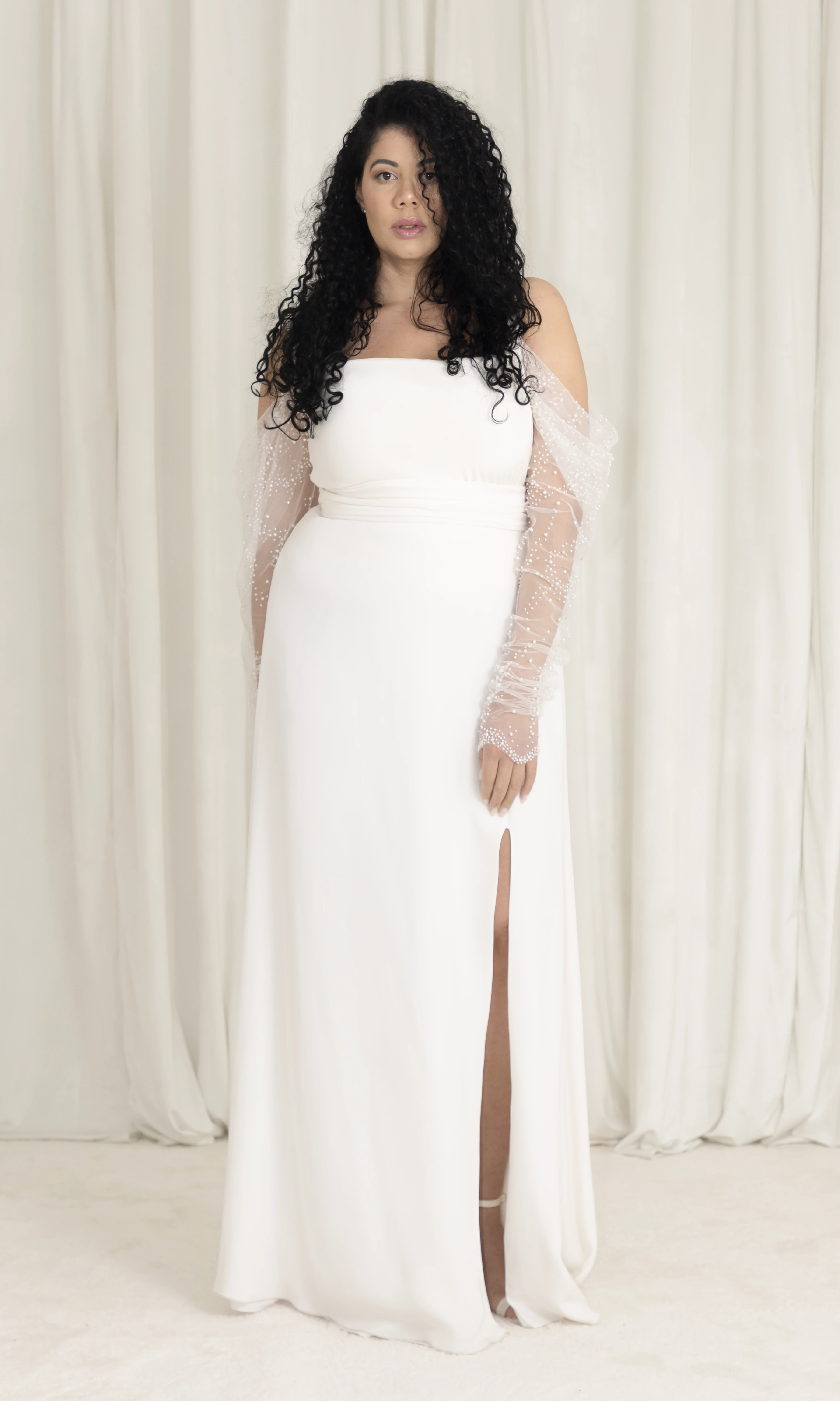 Sandrine Rocher Derichebourg: ” The long-sleeved, loose-fitting top in pearl-embroidered tulle will add a touch of delicacy to your bridal ensemble.“