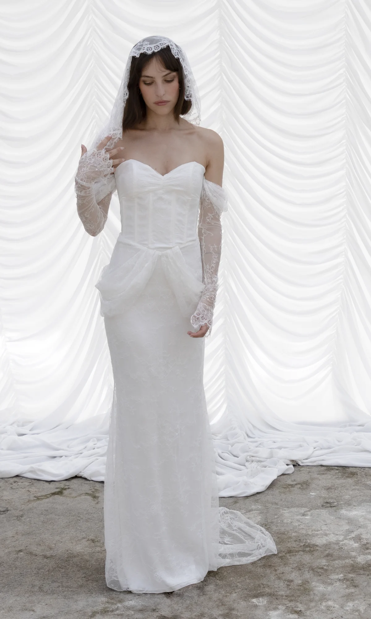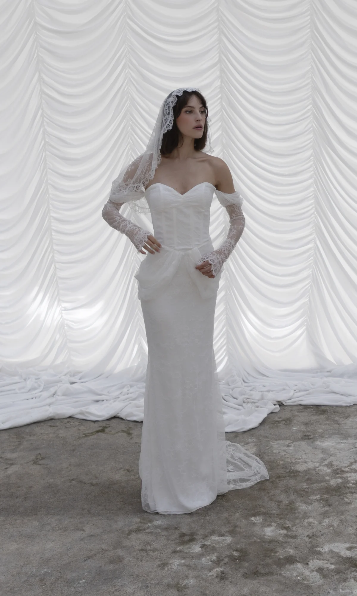 This lace-up corset wedding dress will enhance your figure. Worn with matching gloves and a short veil, all you have to do is wait for the big day. Everything you need to look elegant and attractive is right here.