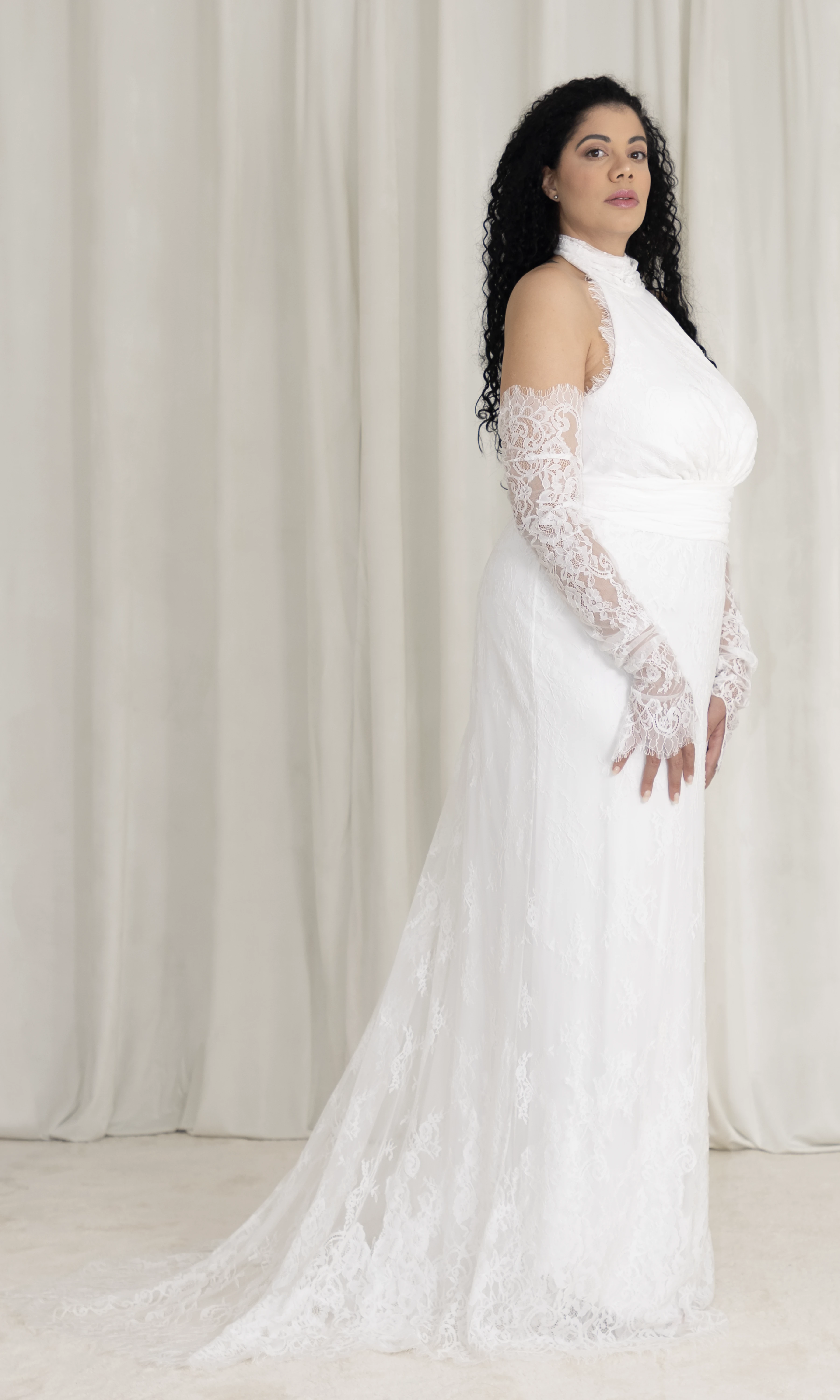 This fine lace wedding dress is even more beautiful up close. You will appreciate its open back which will still allow you to wear a bra and its wide pleated belt which highlights the waist and curves. Little nice detail: the mittens are included with the dress!