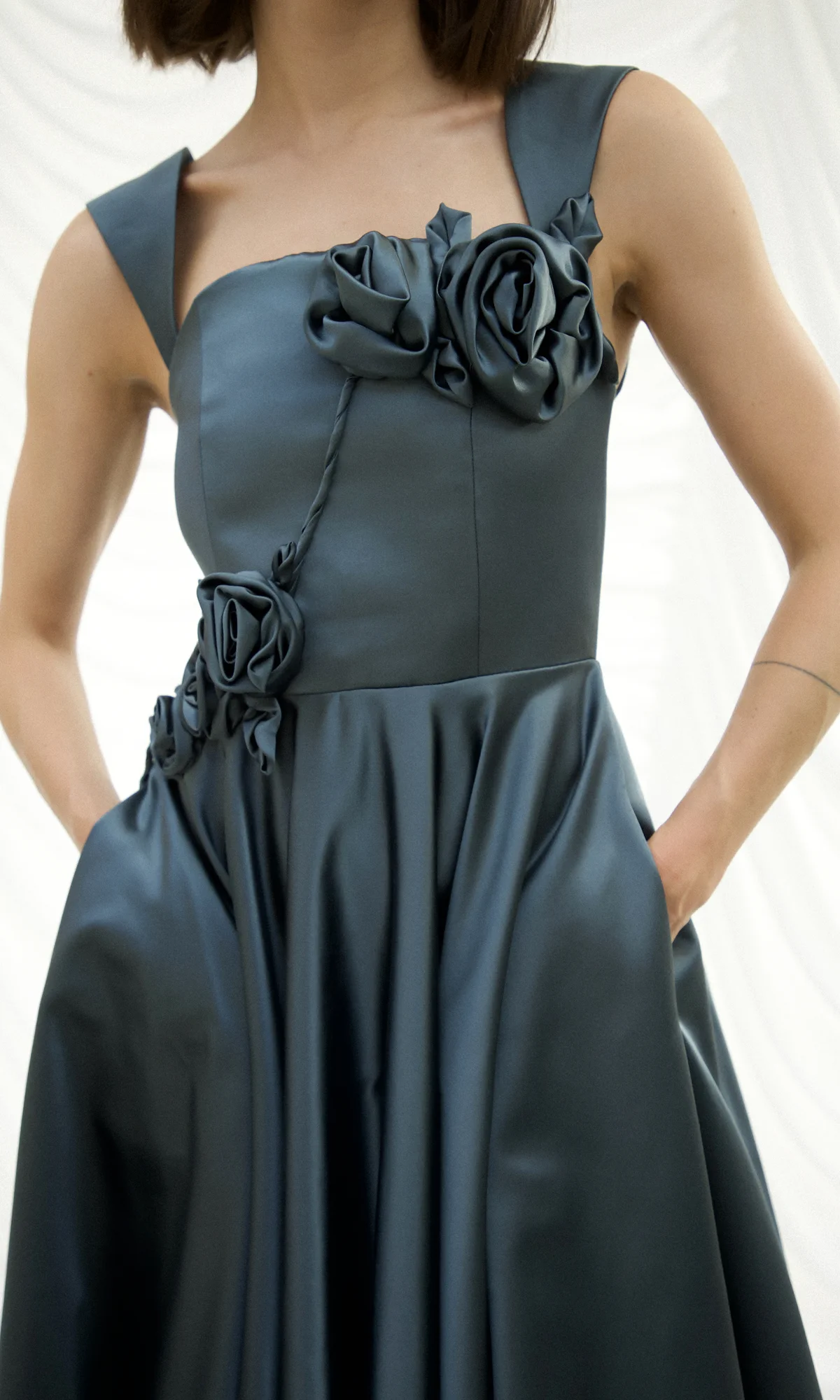 I really love this cocktail dress, which is perfect for all special occasions! Its 3D roses, made by us, are exquisite, and the midi length is absolutely elegant. Made entirely of silk, you’ll want to wear this pretty dress again and again.