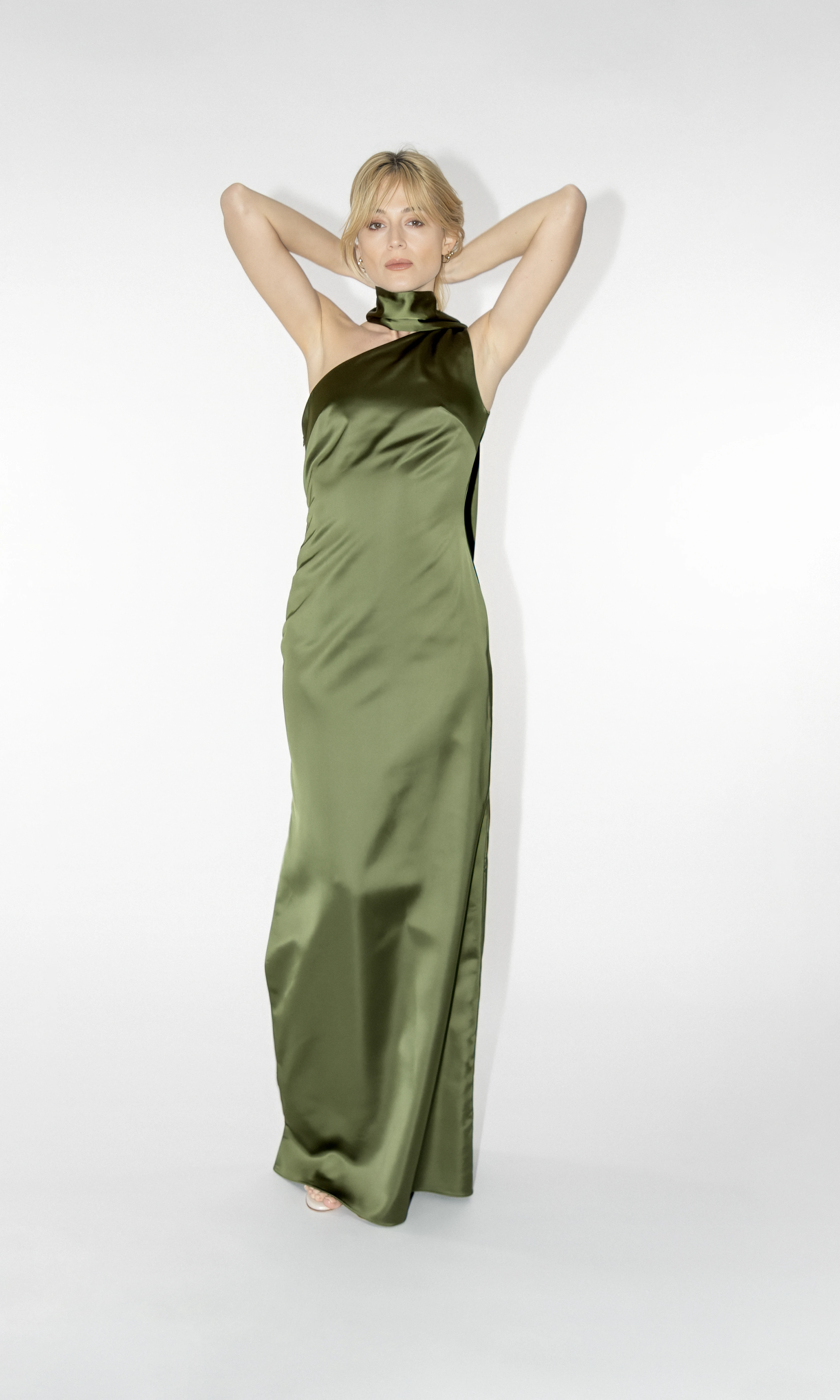 You will love this asymmetrical evening dress with its flowing drape. Ideal for a wedding or evening event.