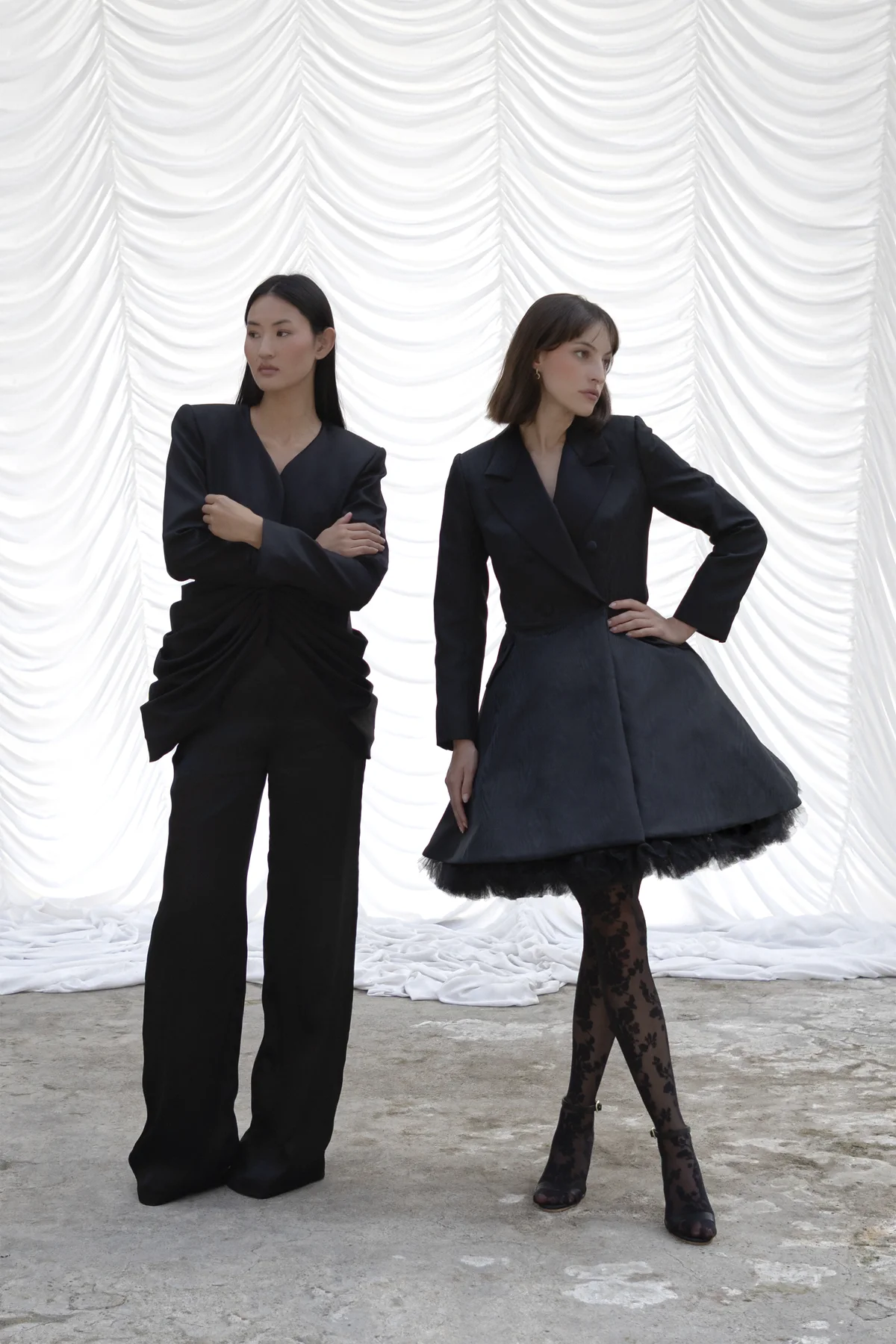 J’ai imaginé ce tailleur traditionnel ultra féminin (veste fabriquée à la main, entoilée et doublée) en pensant aux thèmes forts de la collection: drapés, minimalisme et élégance intemporelle.