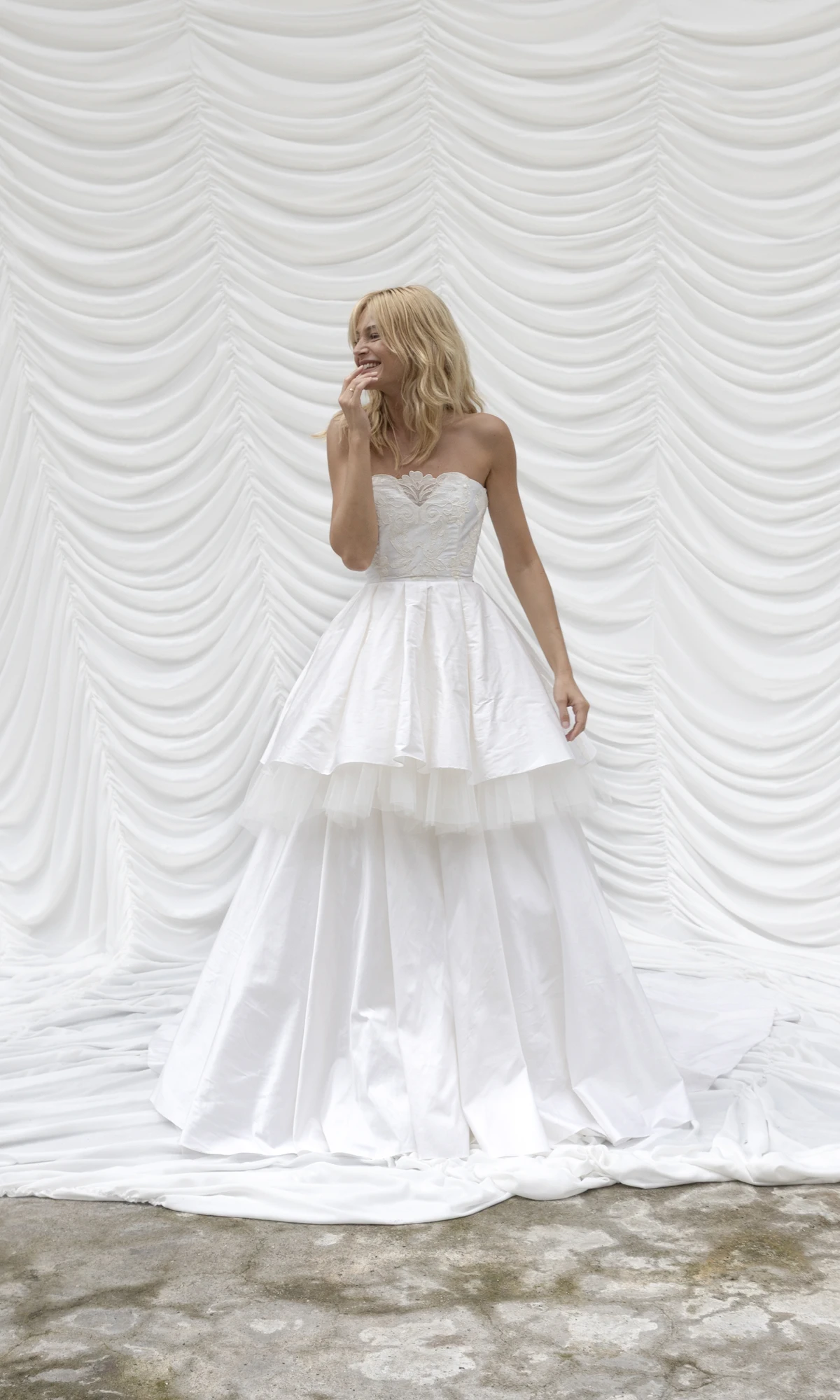 Cette robe de mariée princesse modulable en soie doupion et dentelle ancienne a été créée spécialement pour vous inviter au rêve.