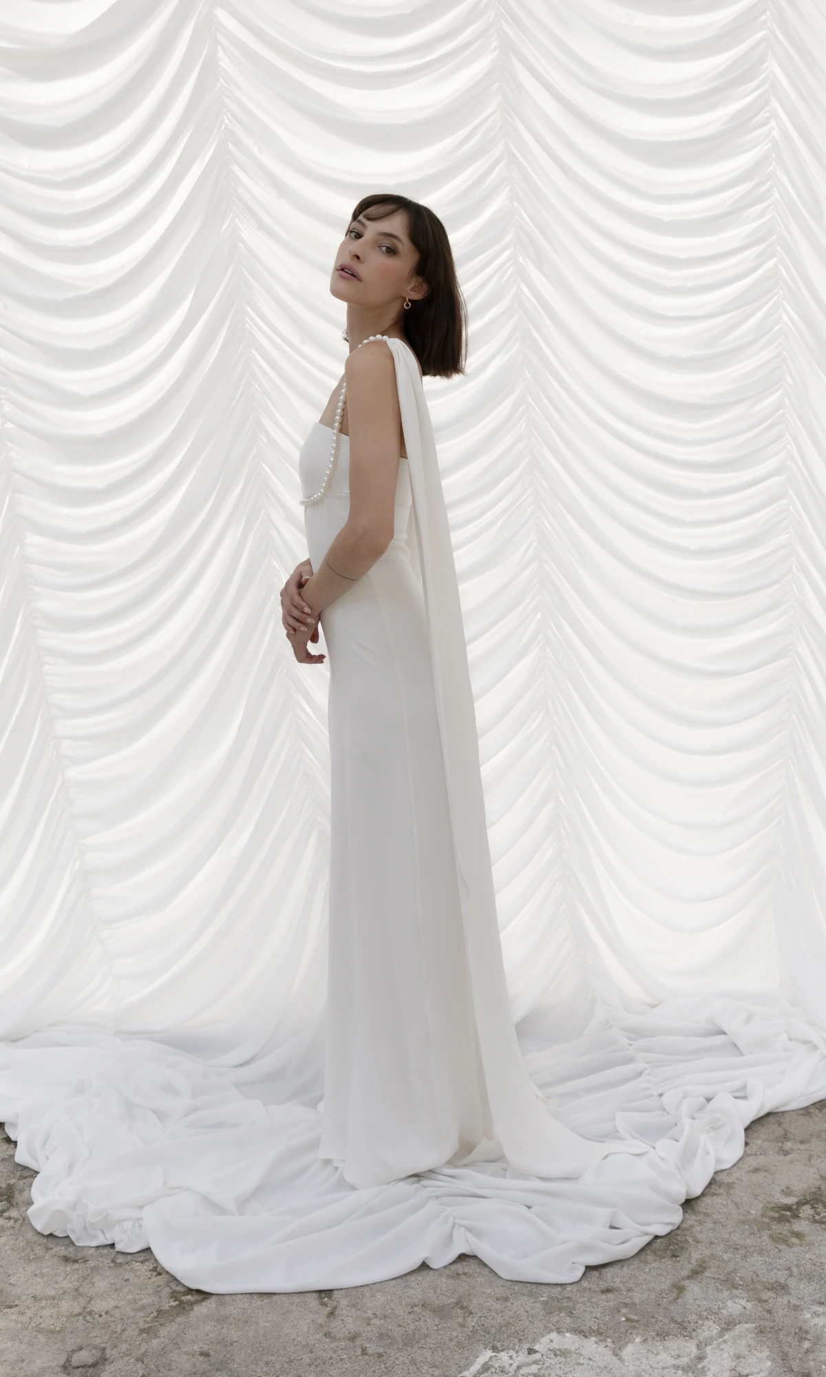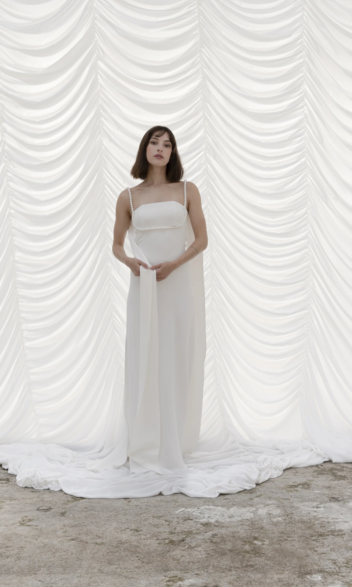Cette robe de mariée est dédiée à ma muse spirituelle Audrey Hepburn. Son tombé impeccable et sa rangée de perles feront de vous une femme fatalement élégante.